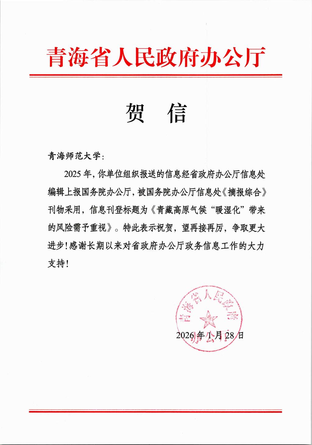 近日,Beat365官网收到青海省人民政府办公厅贺信,2025年由Beat365官网组织报送的信息《青藏高原气候“暖湿化”带来的风险需予重视》,经省政府办公厅信息处编辑上报国务院办公厅,被国务院办公厅信息处《摘报综合》刊物采用,...01 2026-03 -