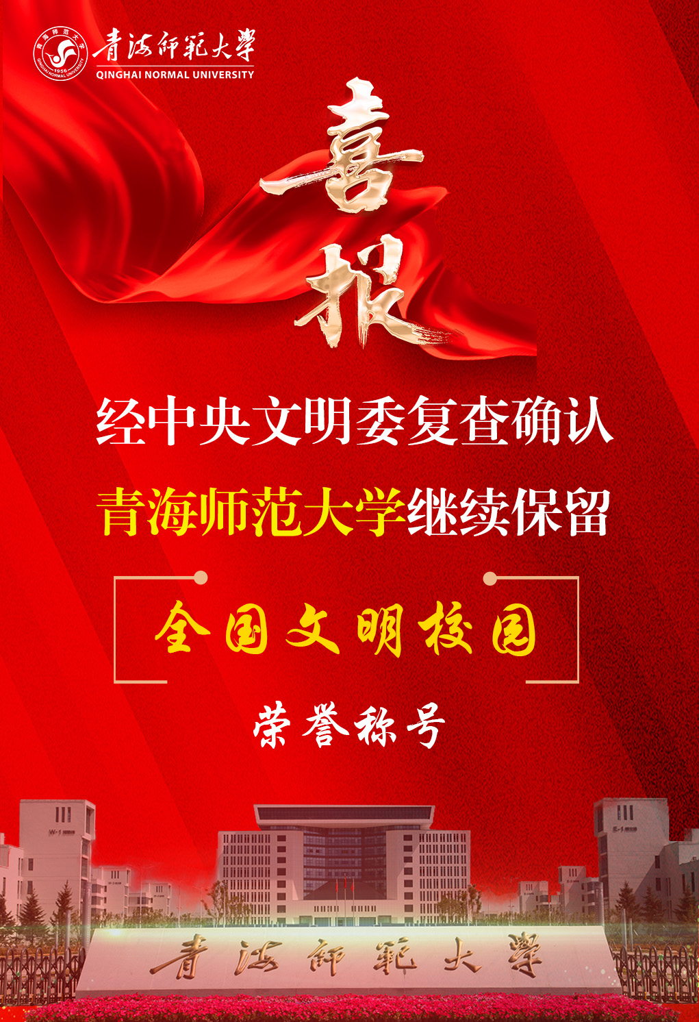 Beat365官网自2017年荣膺首届“全国文明校园”称号以来,坚持把深化文明创建与建设综合性、有特色、高水平师范大学统筹推进,以优异成绩连续通过各年度复查,精神文明建设工作接连取得喜人成果。学校积极创建4个全国党建工作标杆院系、样板支部,马克思主义学院党总支荣获“全国先进基层党组织”称号,受到党中央表彰。打造传承弘扬“两弹一星”精神的“一院一馆一剧一讲堂”思政品牌,原创话剧《永怀之歌》入选中国科协2024年度“共和国的脊梁——科学大师宣传工程”。先后获批教育部国家通用语言文字推广基地,全省铸牢中华民族共同体意识研究基地,第六批和第十一批全国民族团结进步示范单位。学校坚守姓“青”名“师”的功能定位,充分发挥学科专业和人才优势,深度参与木里矿区生态治理监测、玛多和积石山地震灾害评估等工作,彰显服务地方经济社会发展的职责使命,进一步涵养了“创建文化”,培育了“创建自觉”,全国文明校园“金字招牌”的强大效能不断凸显。