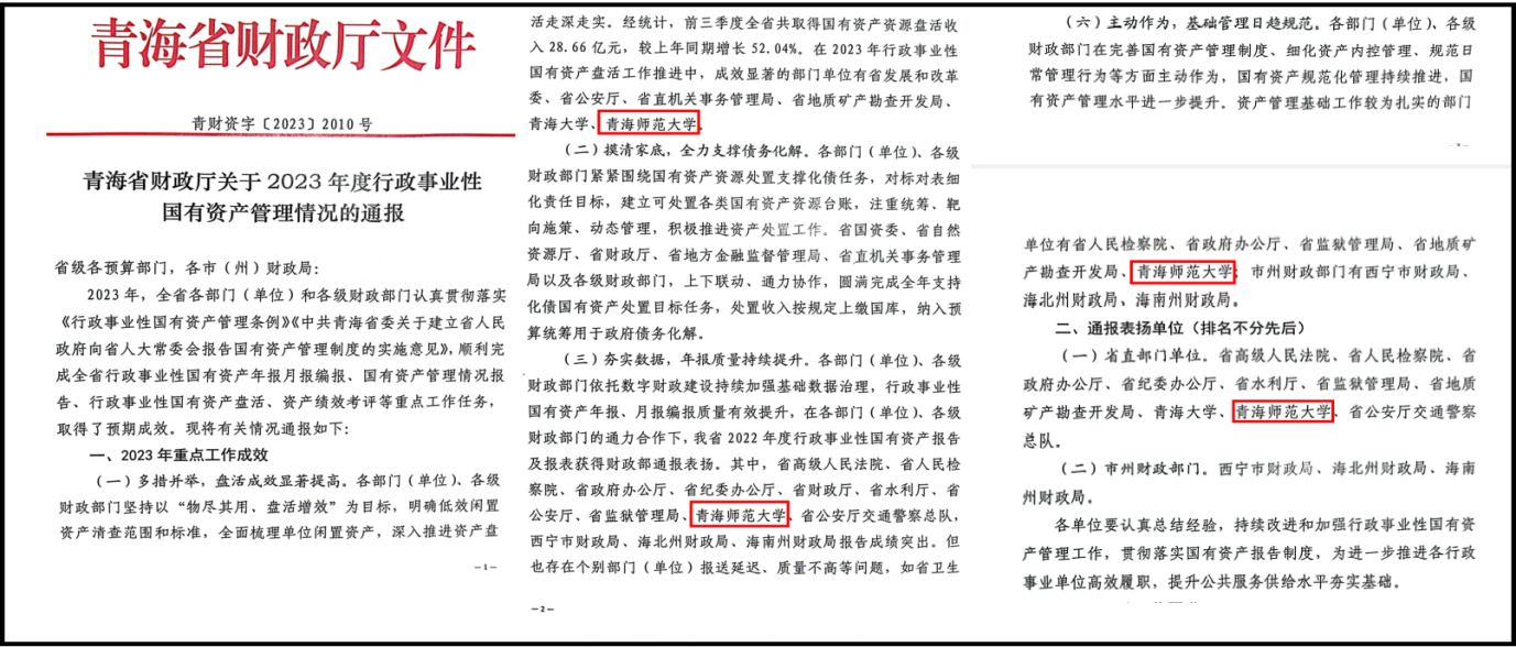 近日,省财政厅印发《青海省财政厅关于2023年度行政事业性国有资产管理情况的通报》(青财资字〔2023〕2010号),对2023年全省行政事业单位国有资产管理工作进行通报。Beat365官网在资产管理制度建设、编标编制、资产盘活等方面工作成绩突出,受到通报表扬。