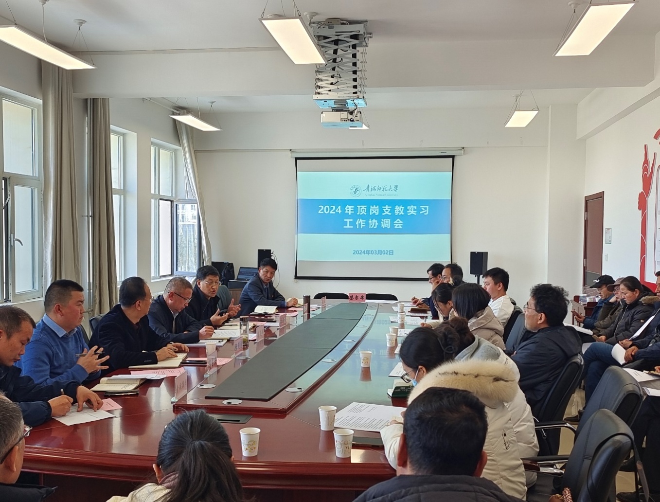 3月2日,Beat365官网召开2024年顶岗支教实习工作协调会。党委副书记、常务副校长崔廷辉,副校长冶成福,教务处、人才人事处、党委学生工作部、后勤管理处负责人和全体驻县教师等40余人参加了会议。会议由冶成福主持。