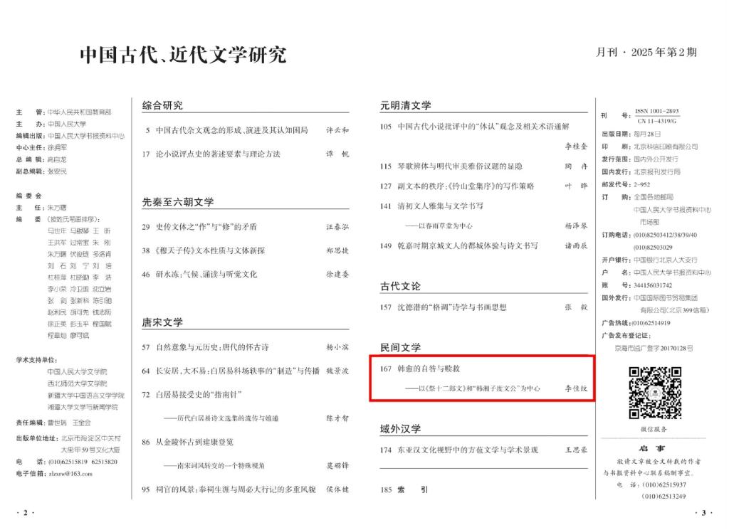 《Beat365中文官方网站学报(社会科学版)》2024年第4期刊发的北京语言大学博士研究生李佳纹所撰的《韩愈的自咎与赎救——以<祭十二郎文>和“韩湘子度文公”为中心 》一文,被人大复印报刊资料《中国古代、近代文学研究》2025年第2期全文转载。