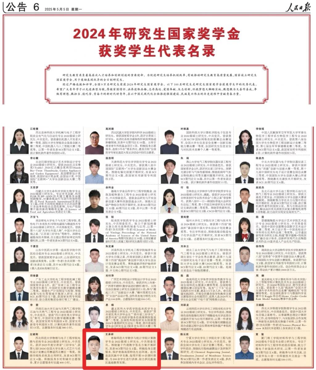 近日,数学与统计学院2022级计算数学专业硕士研究生王承祥,凭借优异表现登上《人民日报》“2024年研究生国家奖学金获奖学生代表名录”。