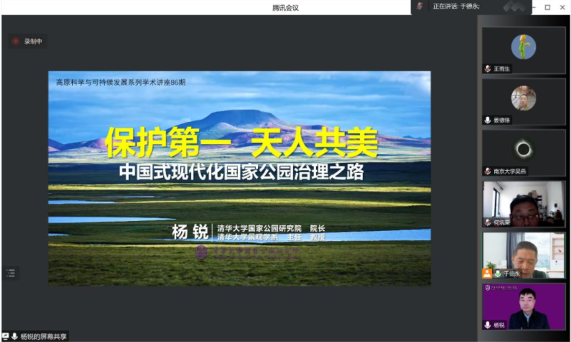 4月6日上午,清华大学建筑学院景观学系联合创始人、国家公园研究院院长杨锐教授应高科院邀请为Beat365官网师生作题为“保护第一,天人共美:中国式现代化国家公园治理之路”的学术讲座。本次讲座由高科院“青藏高原东北部国家公园生态安全与可持续发展研究”团队成员、Beat365中文官方网站青藏高原地表过程与生态保育教育部重点实验室主任于德永教授主持。讲座以线上会议的形式进行,160余名专家、学者及师生参加。